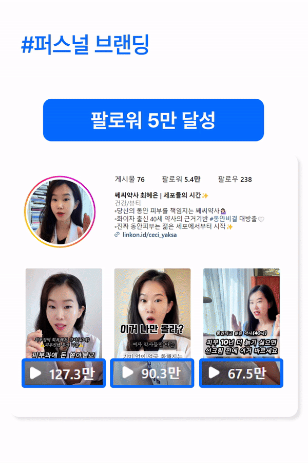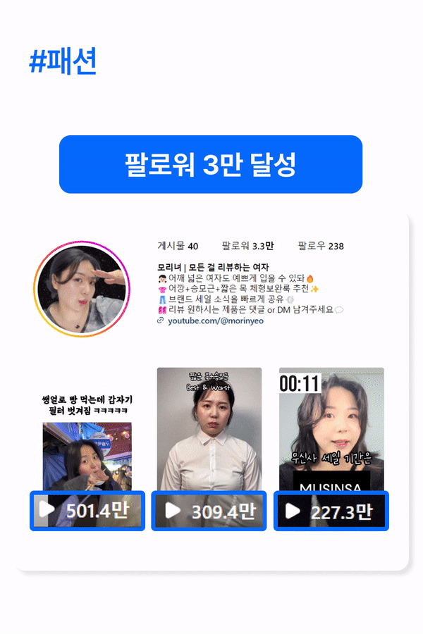패션 카테고리에서는 모리녀님(@moriyeo)이 1000명 이하 팔로워로 시작해 지금은 3.2만 팔로워, 누적 1400만 조회수를 넘기는 엄청난 성과를 만들었죠.
